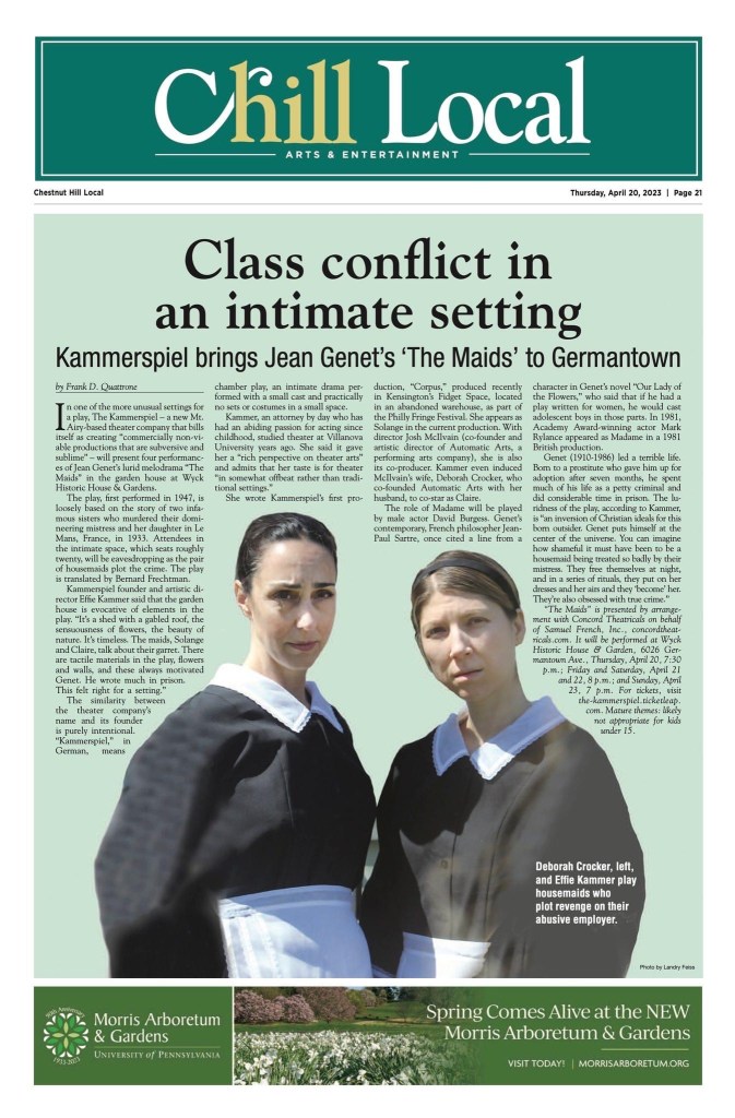 The Maids Written by Jean Genet Translated by Bernard Frechtman Directed by Josh McIlvain Performed by David Burgess, Deborah Crocker, and Effie Kammer Two maids plot the murder of their mistress. Performed in the shed at the Wyck Historic House April 20 - 23, 2023.